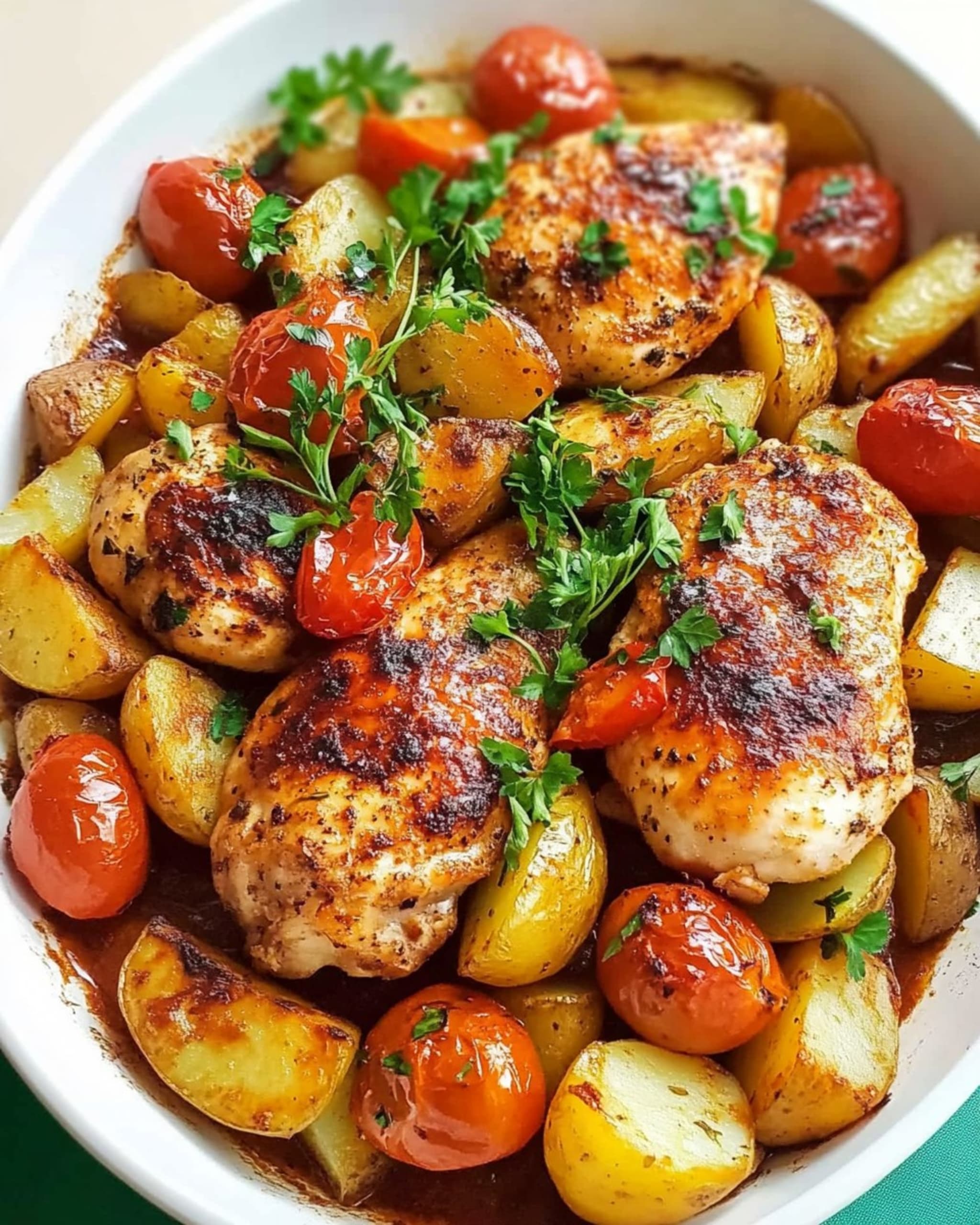 Juicy chicken thighs are coated in a smoky paprika seasoning, then roasted alongside crispy baby potatoes and sweet, juicy cherry tomatoes. As everything cooks together, the flavors blend beautifully, creating a comforting meal that feels much more special than its simple ingredients suggest.